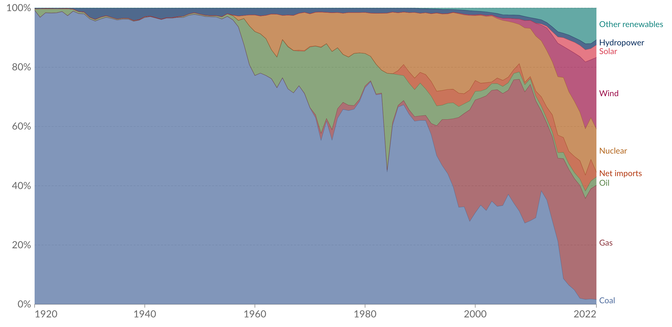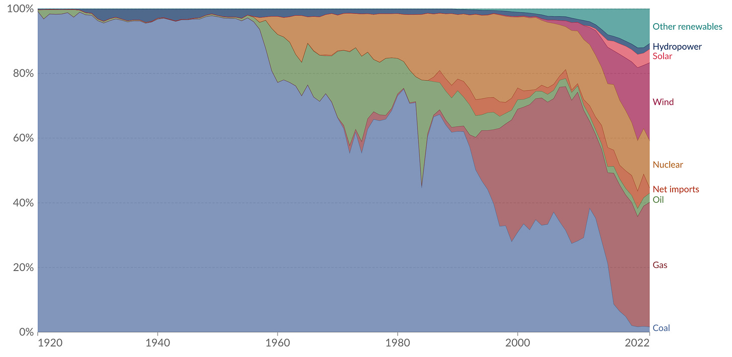 Are these renewables increasing enough? Not currently, no. Renewables need to triple in capacity by 2030. Companies need to invest in battery storage to run energy grids when the wind isn’t blowing and the sun isn’t shining. The below is a breakdown of the UK’s electricity generation over time - and we still rely on natural gas for 40% of our lights, laptop chargers, and binge-watching Married at First Sight.