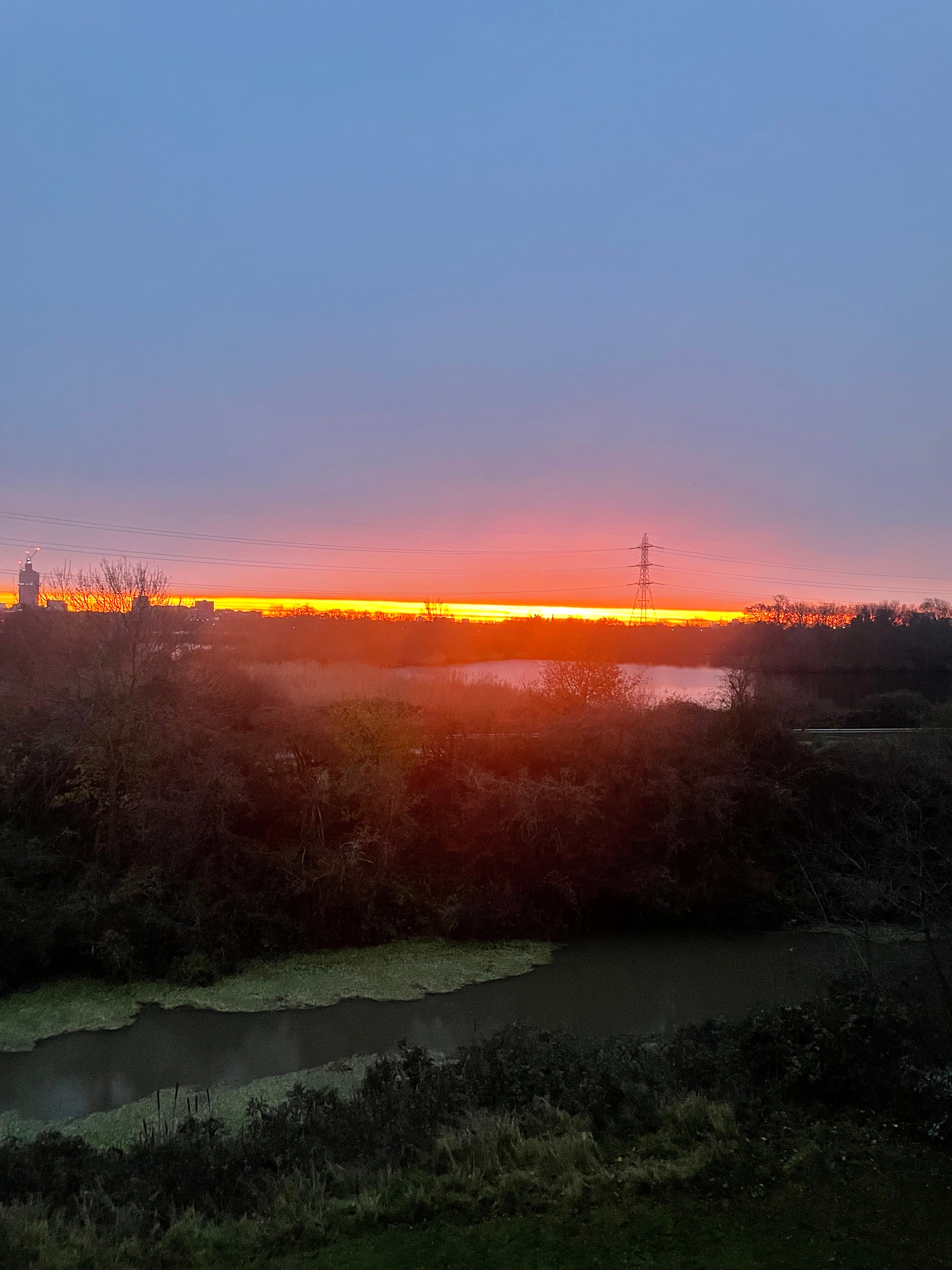A song thrush calls at the dawn’s amber glow on the horizon. The fox, prowling all night, returns to its den. The night shift lasts longer, the day shift is quieter. The city wakes slowly as the year grows old.
