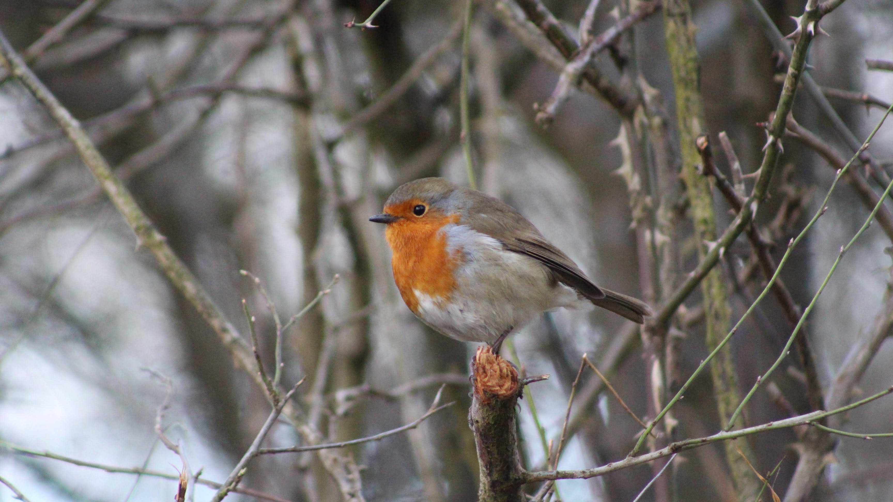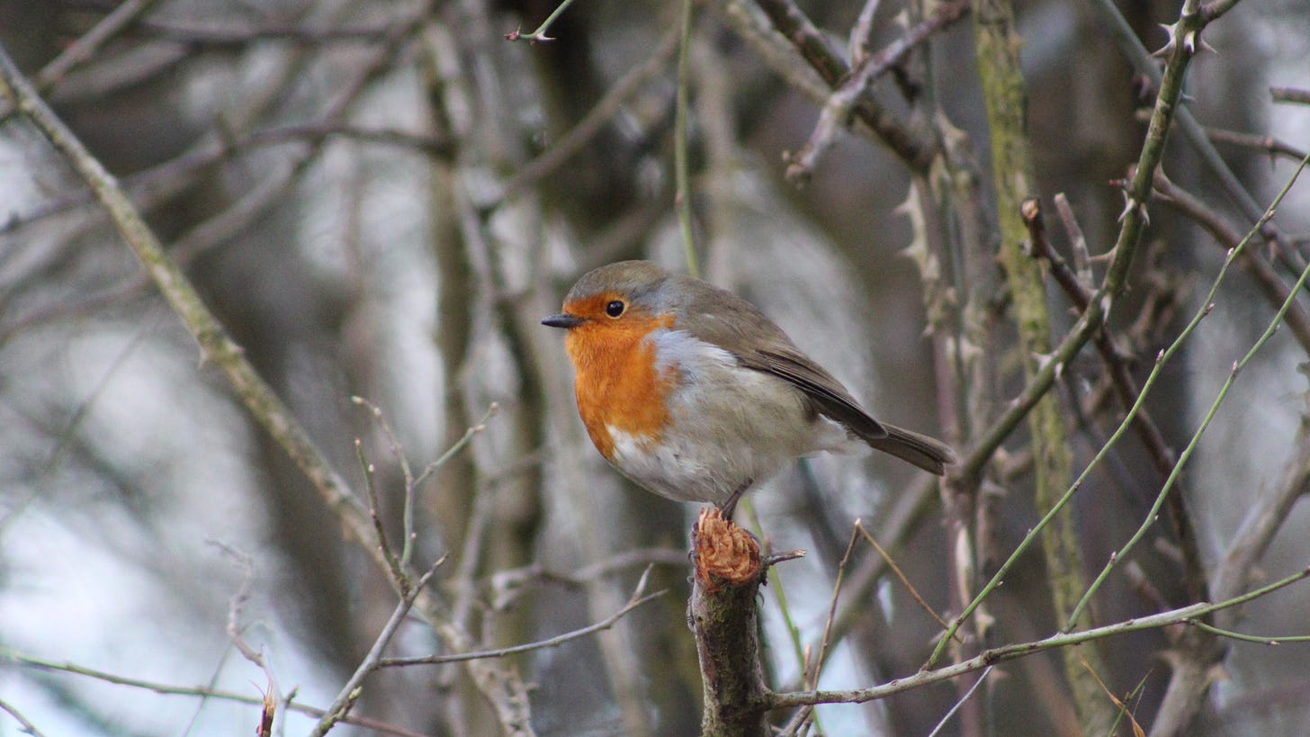 The robin sings all winter, its red breast striking against the bleak white of the winter sky. In the garden it may strike a postcard-perfect pose on a spade handle, jutting from the snow.