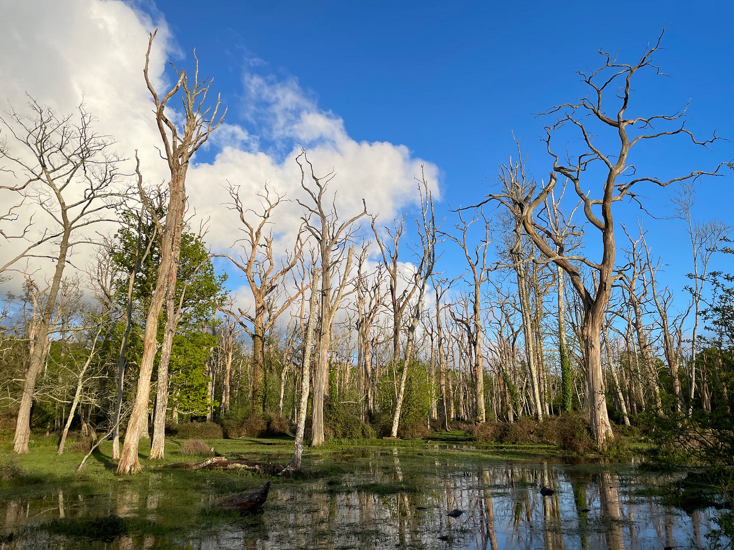 Across a bridge, an eerie sight. A graveyard of dead oak trees, bone white and leafless, skeletal frames stark against a blue sky. Egrets, herons and mallards seemed to thrive in the flooded waters, and a persistent woodpecker drilled the deadwood nearby. Whether this was a part of nature’s course or a failed forestry plantation I’m not sure, but it was ethereal and beautiful all the same.