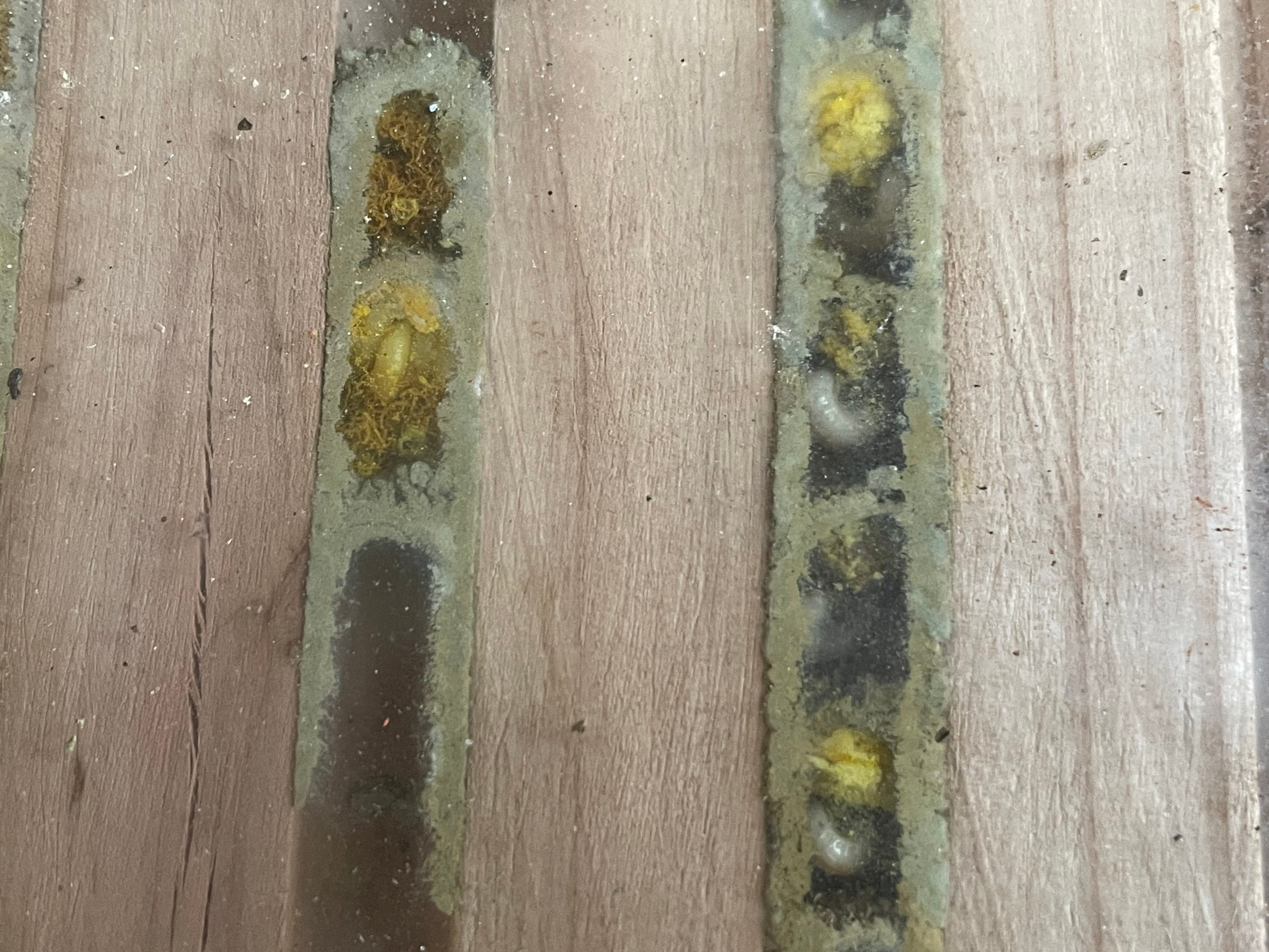 Insects such as solitary bees will carefully inspect every available hole, looking for the perfect nook, before reversing in, laying their eggs and sealing the entrance. The larvae will then hatch in their own time, eat their way out of the nest, and the wide world awaits.