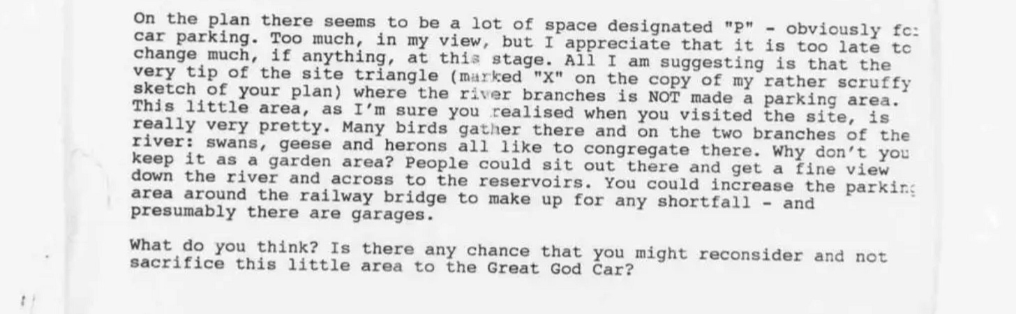 In 1993, when the estate was first developed, the plans included turning the entire far end of the street into a car park. A concerned resident overlooking the site wrote to the developers about how the end of the street was a pretty meeting point for waterbirds, a place for people to picnic, and requested they ‘reconsider sacrificing this little area to the Great God Car.’ The developers agreed and left it as a green patch where geese and people sunbathe in the summer to this day.
